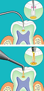 The graphic shows how conventional instruments cannot reach some suspect areas in teeth. DIAGNOdent has the great advantage of detecting cavities in the very early stage by measuring the laser fluroescence within the tooth structure, returning reliable and precise results without x-ray exposure.